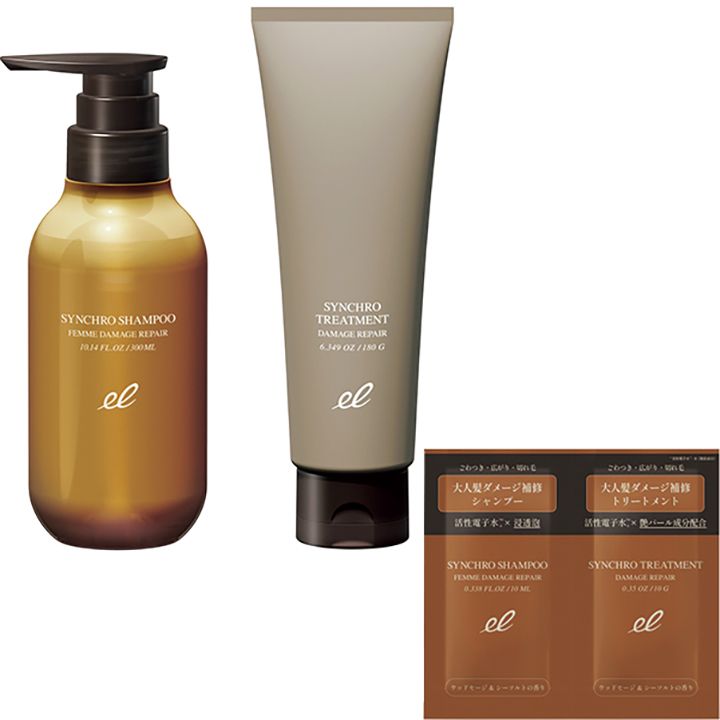 浸透泡発想で大人のダメージ補修ケアを。エレクトロン シンクロシャンプー ファム ダメージリペア(女性用ヘアシャンプー)、シンクロトリートメント ダメージリペア(ヘアトリートメント)各1包