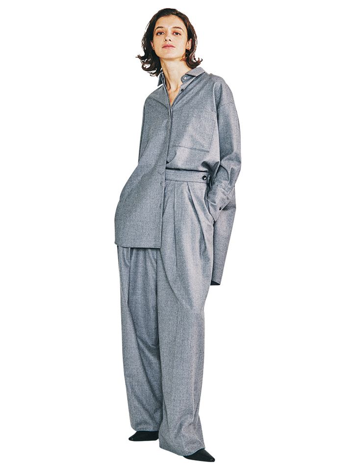 あたたかみのあるウール素材に、聡明なグレーでキレを加算。シャツはフロント途中までを比翼で仕立てたモダンなルックス。ウエストのもたつきを回避するサイドボタンと、縦落ち感をアシストする深めのタックが脚をキレイに見せてくれるワイドスラックス。ゆったりサイズでノンストレス。