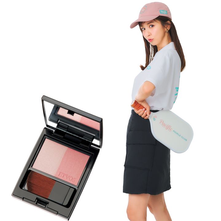 「ピックルボール」に初挑戦。「アキは下手だな」と夫にいじられムッとしたけど怒るときも可愛くが’25年のテーマ。写真左:2色のコーラルがピュアな印象。ミネラルプレストチーク シェリーコーラル ¥4,180※1/8発売(エトヴォス)