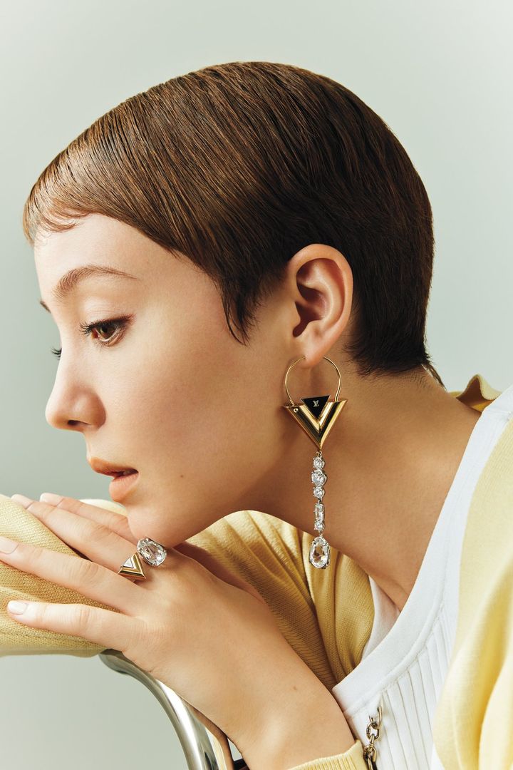 バッグとブーツ同様、伊勢丹新宿店のみで発売するシングルピアス。ルイ・ヴィトンのクラフツマンシップが際立つマスターピースで、ゴールドカラーの丸みを帯びた大きな〝V〞が特徴。ピアスの複数のストラスや、同モチーフを取り入れたリングの大粒なストラスがラグジュアリー感をアップさせる。