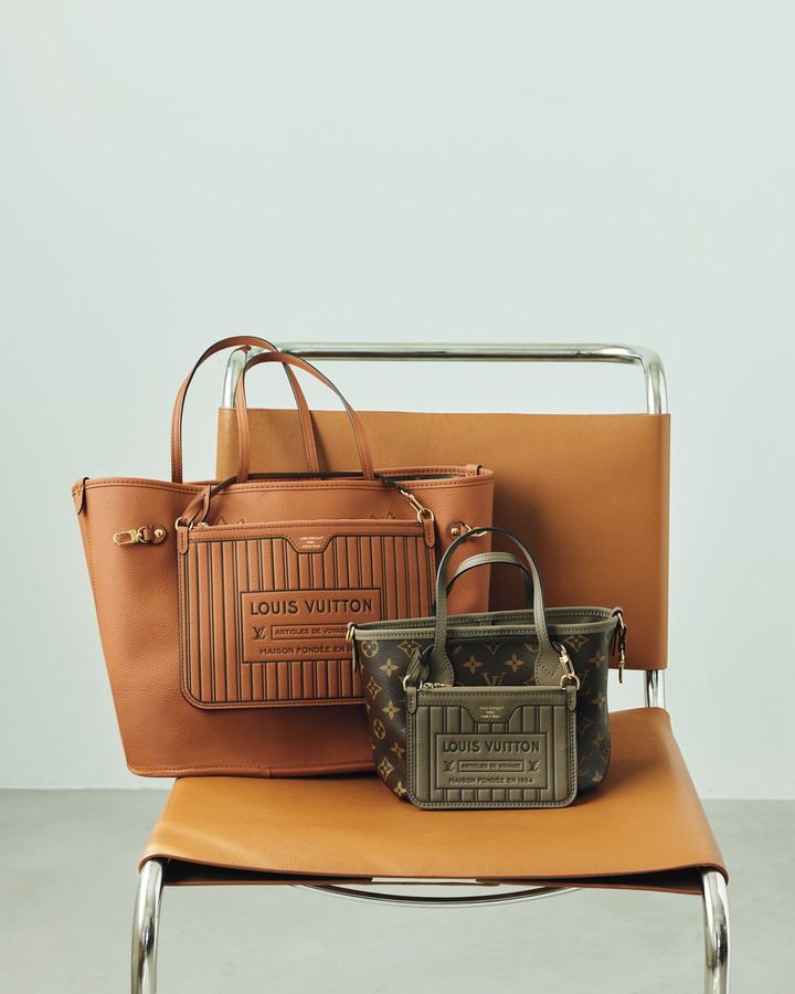 2007年に誕生したアイコニックなバッグ〝ネヴァーフル〞をビビッドなカラー、かつリバーシブルのデザインでアップデートした新作。片面はグレインレザー、もう片面はメゾンを象徴するモノグラム・キャンバスで仕上げた。外ポケットとしても、単体でショルダーバッグとしても活用できる取り外し可能なポーチもついている。