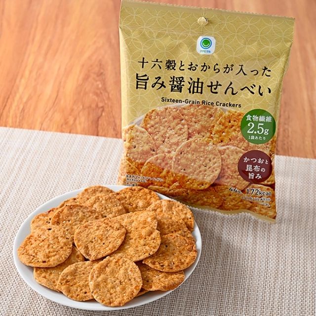 ファミリーマートの「十六穀とおからが入った旨み醤油せんべい」は、ひと袋食べきっても172kcalしかありません。しょうゆ味がしっかり効いていて、ダイエット中でも気にせず、満足感が得られます。価格も138円(税込)と手ごろなので、間食用にストックしておくのもいいですね♪