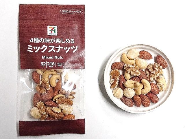 セブンイレブンの「7プレミアム ミックスナッツ 32g」は、ナッツの種類に合ったローストの仕方で作られています。1つ注意点としては、ナッツ類の摂取目安は1日約20〜30g程なので、ひと袋全部食べてしまうのは禁物。チャックがついていて保存もできるので、食べ過ぎ防止になりますよ!