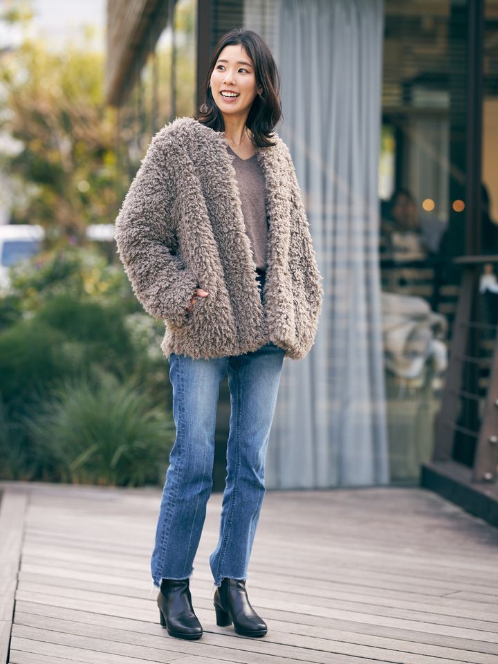 jacket/CHAROL denim pants/YANUK tops/UNIQLO shoes/Daniella & GEMMA