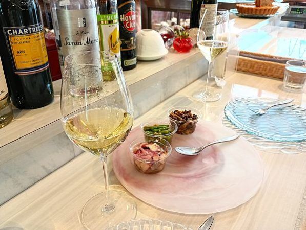イートインはソムリエでもあるオーナーシェフがセレクトしたグラスワインと共に