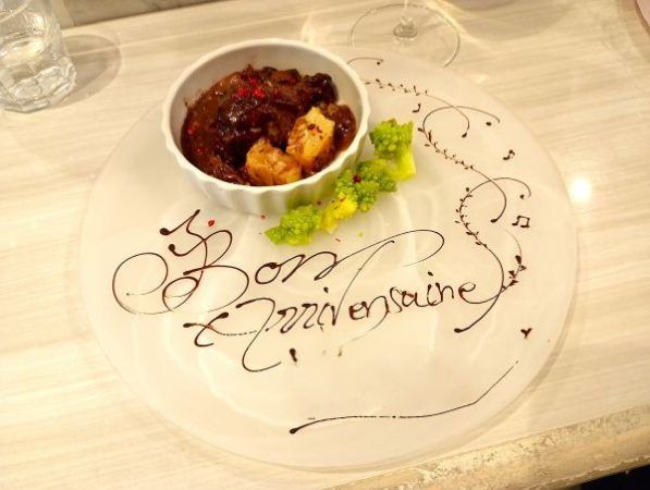 「軽く食べ飲みしよう」と思っていたら、なんと!手羽元の赤ワイン煮がのったお誕生日プレートが出てきました! この日は実は私の誕生日の翌日。一緒に行った夫が内緒でシェフにお願いしてくれていたそうです。 事前に相談すれば、こんなサプライズサービスもしてくださる、とても気さくで素敵なオーナーさんでした。 (※プレートは3日前くらいに相談が必要とのこと。本当はスイーツを乗せる予定だったそうですが、私がスイーツよりも肉を選んでしまったという裏話も…)