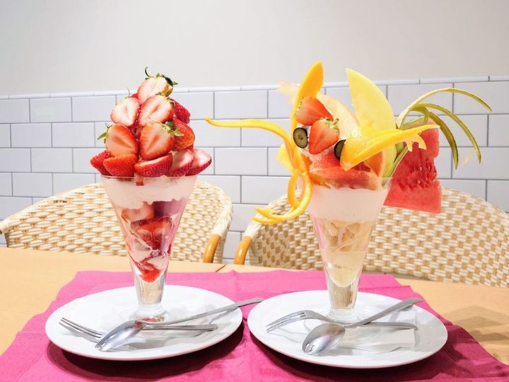 10〜12種類の旬の果物が贅沢に盛られた「フルーツパフェ」(右)(税込1,740円)は、全店舗で一番の人気を誇るパフェ。誕生から52年間、変わらない形で人々に愛され続ける名物パフェで、一回は味わうべき逸品です。