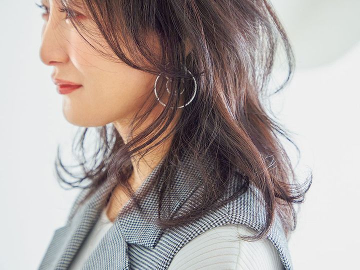 ボリュームを出そうとすると変に広がるので、パーマの巻き方を内巻き外巻きと計算してランダムに仕上げて。顔周りに緩くボリュームが出ることで女性らしさも際立ちます。