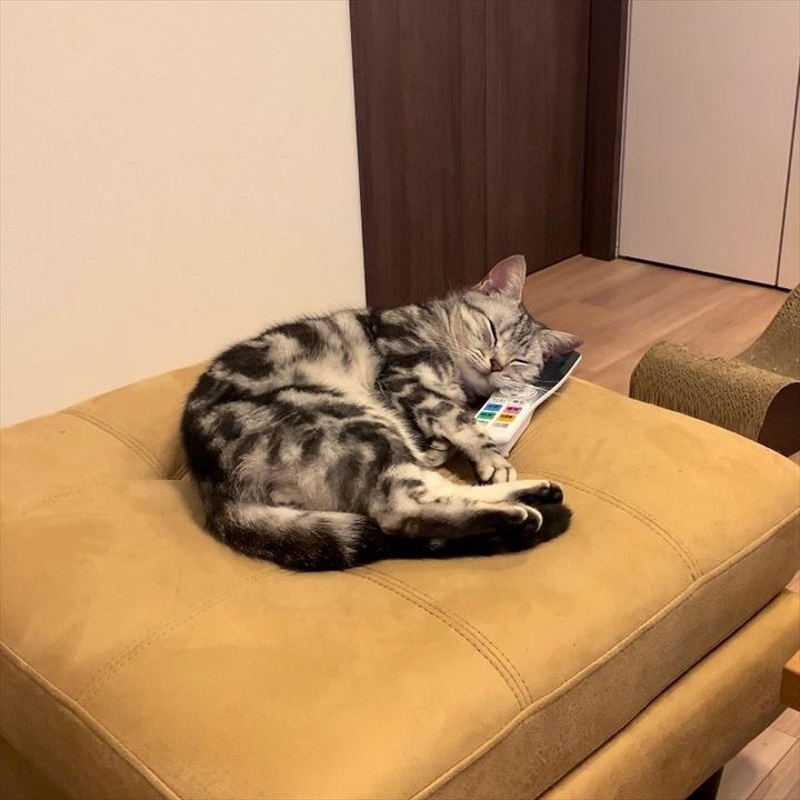 リモコンを枕代わりに使っていたネコ。 その姿が話題になっています!
