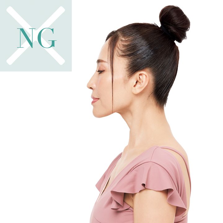 肩より前に頭が出て、あごを突き出すようなNG姿勢。スマホやPC、料理など、前かがみの姿勢が多いのが原因です。あご下がたるんで首も短く見えます。