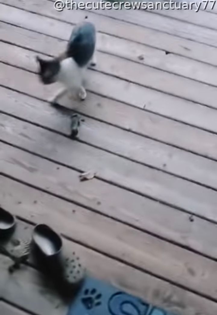 アメリカ・ジョージア州で撮影されたこの動画は、愛猫に呼ばれた飼い主さんが外へ出るシーンから始まります。