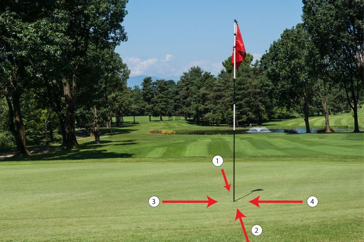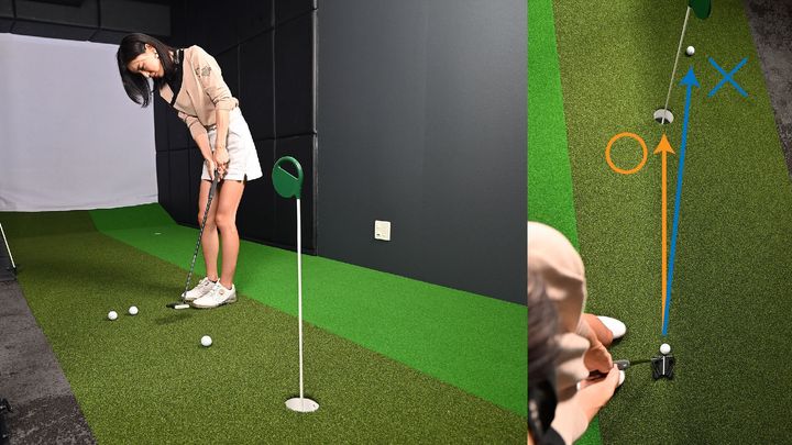 私の見る限り、女性ゴルファーはロングパットを寄せる確率が比較的高いと思います。その反面、ショートパットに苦戦している印象が強いです。そこでスタート前の練習でお勧めしたいのが、真っすぐな1メートルの距離を打つことです。3球打ったら、カップの反対側へ回り、1メートルを打ちます。さらに、左右からも1メートルの距離を打ちましょう。