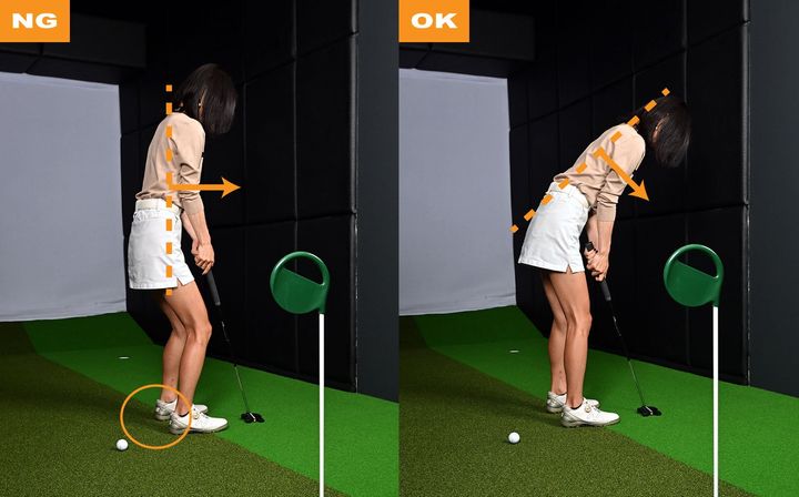 【NG】長いパターを使うとカカト重心となり、上体が起き上がりやすいので要注意【OK】カカト重心にならないように、上体をしっかりと前傾して構えましょう