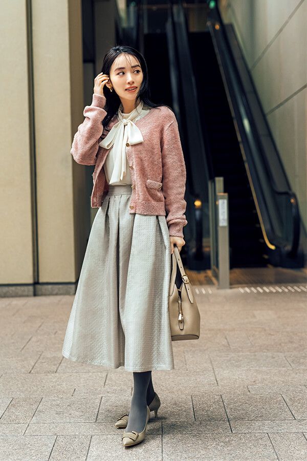 ピンクはカーデで1点のみの絶妙なさじ加減で、知性と華感の両立を。白のブラウス、ベージュの小物と、ベーシックカラーとの3色でまとめて上品に。