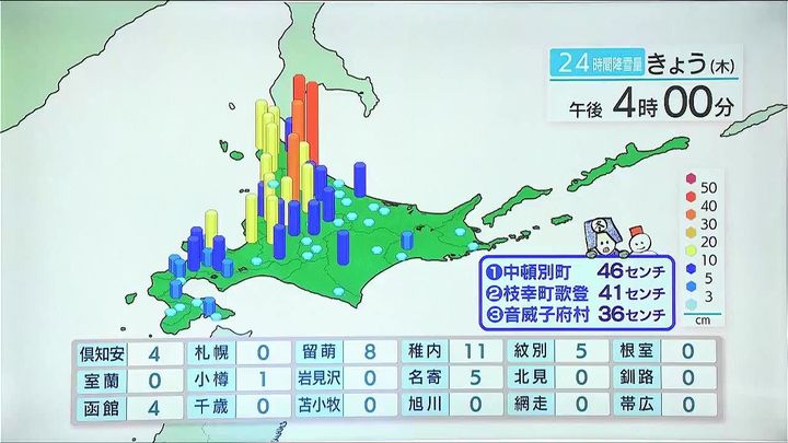 9日午後4時までの24時間に降った雪の量です。道北で局地的に多くなっていて、宗谷南部の中頓別町で46センチ、枝幸町歌登で41センチでした。札幌は0センチでした。