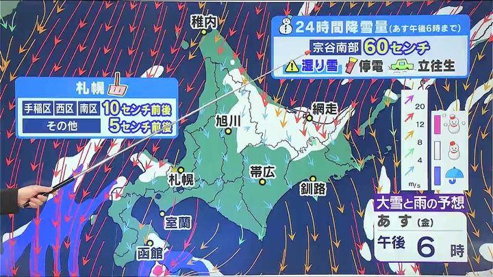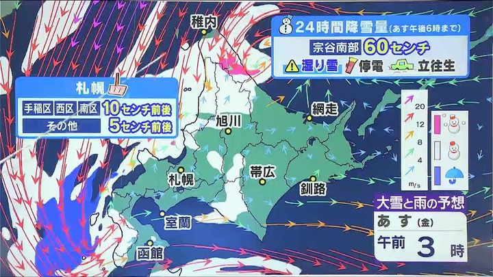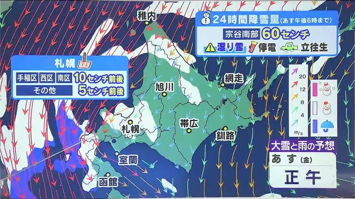 夕方までの24時間に宗谷南部で60センチです。これまでと合わせて降雪量が1メートルに達するかもしれません。