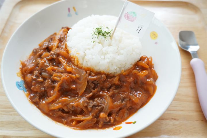 子どもには、お茶碗を使ってご飯を丸くよそい、お子さまランチ風に盛り付けてみました。