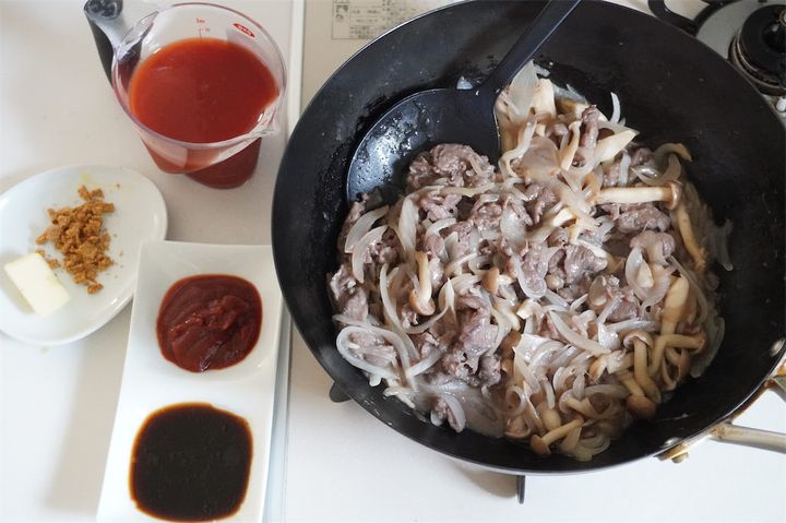 市販のルウで作るときは水を加えますが、このレシピでは水を使わずにトマトジュースで煮込みます。トマトの旨味が凝縮しているトマトジュースを使うことで、じっくり煮込んだかのような味が生まれ、そこに、バターや赤ワインを入れることでコクが加わり、短時間でも本格的な味に仕上がりました。