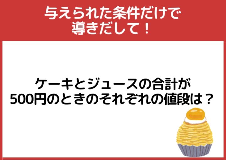 与えられた条件だけで導き出せる?「ケーキとジュースの値段の合計が500円のときの2つの値段」は?