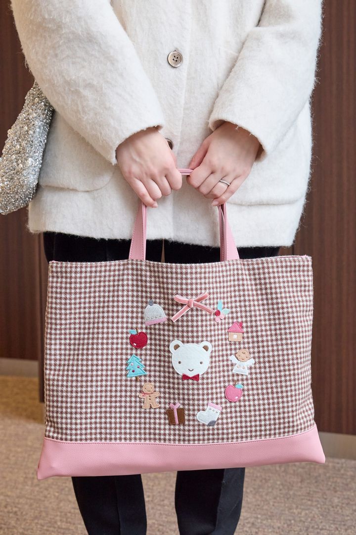 「ピンク×ブラウンチェックとクリスマスデザインに惹かれて購入しました。これを持つときはメインバッグや服に柄は避け、コーデの中心になるようにしています。取手と底がレザーなので多少重たい荷物を入れても型崩れせず、メインバッグに入りきらないものを入れたり、普段は子どもの荷物一式を入れるマザーズバッグとして使っています」飯海菜月さん/34歳・155㎝・薬剤師(1歳の女の子ママ)