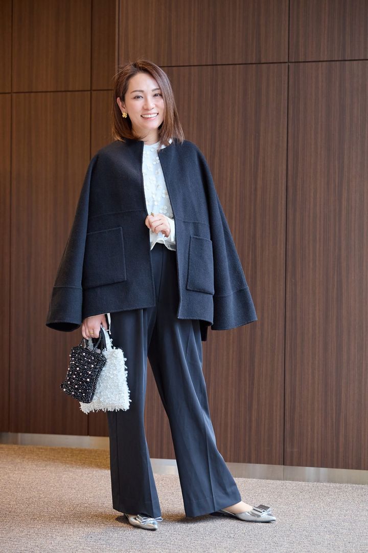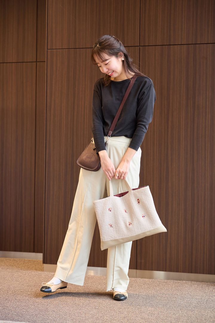 「冬らしさの出せるツイードはモノトーンとグレーの落ち着いたデザインで、通勤バッグとしても使えます。A4も入るので懇談会などの学校行事で活躍することも。シルバーのアンテプリマとも相性が良く、セットで使うことが多いです。ミニバッグに入らなかった荷物以外にも気が付いたら息子のぬいぐるみが入っていることもあり(笑)、割と大容量です」大脇未緒さん/34歳・167㎝・学校事務(7歳の女の子と5歳の男の子ママ)