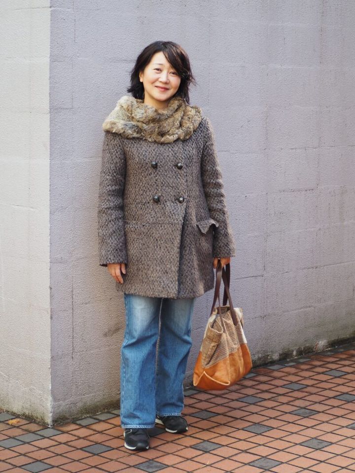 結婚式などのよそいきスタイルにもマッチするスヌードは、16年ほど前に購入した「ジャーナルスタンダード」のもの。「若い頃はゴージャス過ぎる気がして日常着に合わせることがなかったのですが、今となってはしっくりくるような気がして。防寒アイテムのひとつとして活用中です」