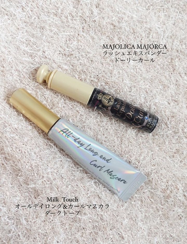 まずマスカラは、トレンドの束感が作れるものを幾つも試した中でおすすめの2つ。Milk Touchで長さとほんのり色味を、マジョリカマジョルカで束にまとめていきます♡私はD.UPのつけまつ毛用ピンセットをいつも使うことが多いです!
