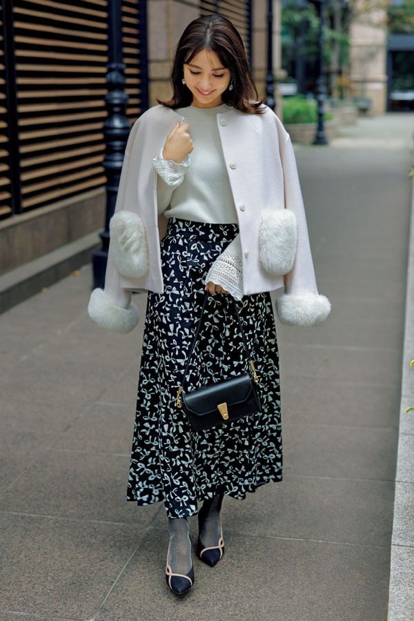 白アウター&ニットで黒面積を減らせば、柔らかな印象のモノトーンが完成。ニットの袖にあしらわれたレースをのぞかせて、さりげない甘さをプラス。