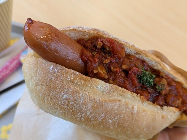 今回は「チリドッグ」(380円)と「ホットコーヒー М」(230円)をいただいてみることにしました。「チリソース」の辛さの調整をお願いすることができますよ。私は辛めのオーダーにしました。 こちらのホットドッグ用パンは、ソフトフランスパンを使用しています。余計な添加物不要のおいしいパンを特注しているそうです。珍しいですよね。