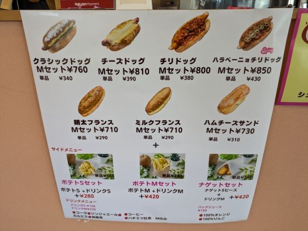 メニューはご覧の通りで、「クラシックドッグ」(340円)や「チーズドッグ」(390円)などのホットドッグの他に、ドリンクやポテト、チキンナゲットなどのサイドメニューもあります。
