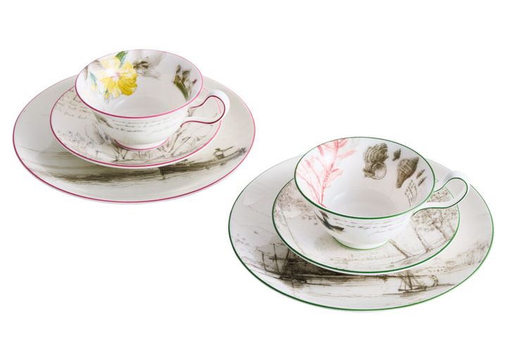 〈ウェッジウッド〉創設者の孫は「進化論」で知られるチャールズ・ダーウィン。彼が航海で訪れた土地をテーマにした”ヴォヤージュ オブ ザ ビーグル”は、当時のスケッチにモダンな彩りを加えたコレクション。右の貝や漁師が描かれた「タヒチ」、左の鮮やかな花が印象的な「ガラパゴス」など、6種が発売。カップ&ソーサー[200㎖]とプレート[∅20.5㎝]のセット各¥27,500(www.wedgwood.jp)