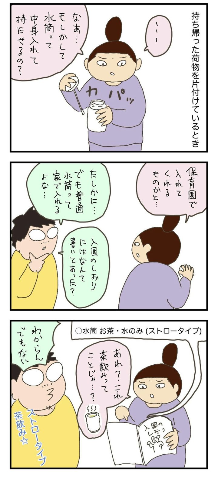 中身は保育園で入れてくれるものと思い込んでいたミナさんですが、確かに水筒を持っていくということは、家で飲み物を入れて持参するということですよね。
