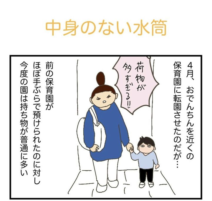 子どもを保育園に通わせるとき、荷物が多いと送り迎えの親の負担も増えるので、なるべくなら荷物は少ないほうがいいですよね。保育園によっては、園で用意してくれるものが異なるので、転園するとその違いに戸惑うことも…。そんな保育園での持ち物についての勘違いをコミカルに描いた、アメーバトップブロガーの桜田麩コウイチ&ミナさんの漫画「中身のない水筒」をごらんください。