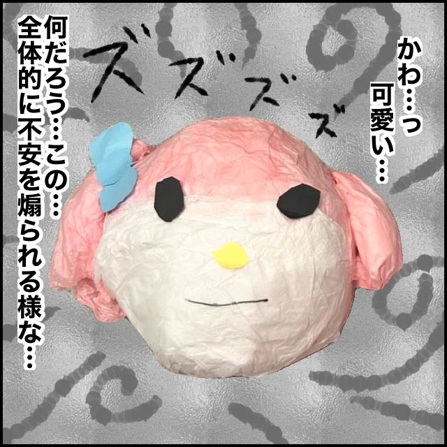 マチ子ちゃん、ふんわり可愛らしいピンク色で上手に作りましたね。何かと何かのハイブリッドのような、でもどこか人間味のあるというか、語りかけてきそうなお面ですね(笑)。