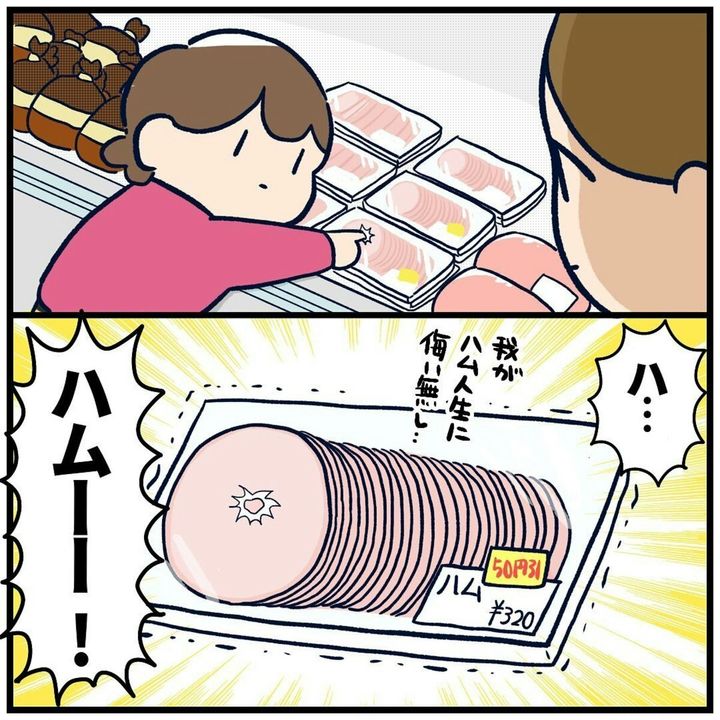 2歳ごろの子どもを連れてスーパーで買い出しをするのは大変ですよね。この時期では、買い物中に娘が陳列された商品に触ってしまった、もす(@mosumanga30)さんのエピソードをご紹介します。ほんの少し目を離した瞬間に、娘がハムのパッケージに穴をあけてしまい痛恨の表情を浮かべるもすさんですが、その後は思わぬ展開になったようです。
