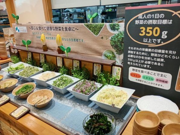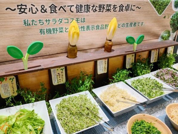 ちこり村の運営会社はサラダコスモ(株)といって岐阜県中津川市に本社を置く野菜づくりを行う企業です。 有機栽培や野菜の機能性に注目したもやし、スプラウト、カット野菜を開発、生産、販売しており、本社はちこり村内にあるんですよ。 カイワレ大根やもやしなどを生産販売している会社が運営しているとあって、サラダバーには様々なスプラウトがズラリ!