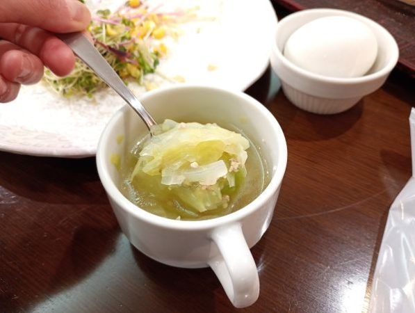 スープも食べ放題なのが嬉しいですね。 この日はキャベツがたっぷりと入ったチキンベースのスープでした。