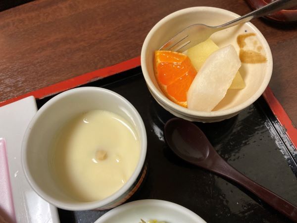 ぷるぷるの茶碗蒸しは鶏肉やかまぼこ、銀杏など具がたっぷり入った甘めのお味。そして食後のフルーツが嬉しい。