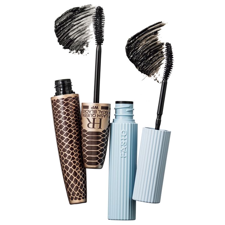 [左]コーティングポリマーが仕上がりを12時間持続。 ラッシュ クイーン コブラブラック WP ¥6,930 (ヘレナ ルビンスタイン)[右]一本一本に繊維が付着して均一な仕上がりに。 ファシオ ウルトラ WP マスカラ (ロング) ¥1,320 〈編集部調べ〉(コーセー)