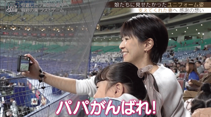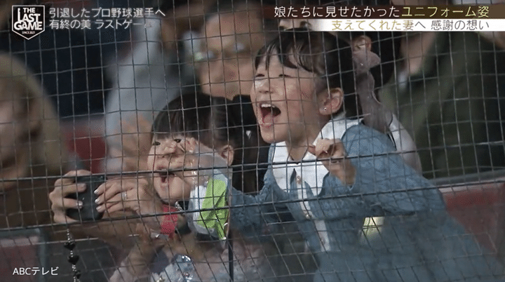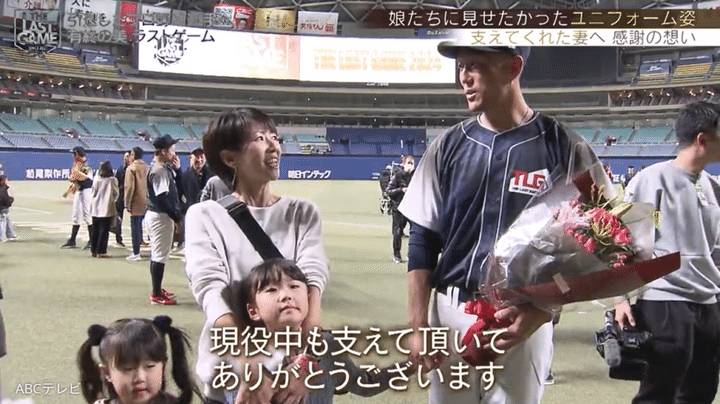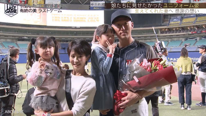 試合後に青松氏は娘たちを抱きしめて、「一番現役中に夢見たのが、子どもに野球をしている姿を見てもらってグラウンドから手を振るっていう。今、夢がかないました」とニッコリ。そして妻へ、「応援に来ていただいて、ありがとうございました。現役中も支えていただいて、ありがとうございます。これからもよろしくお願いします」と感謝した。THE LAST GAMEは、青松一家4人にとって忘れられない思い出になったことだろう。