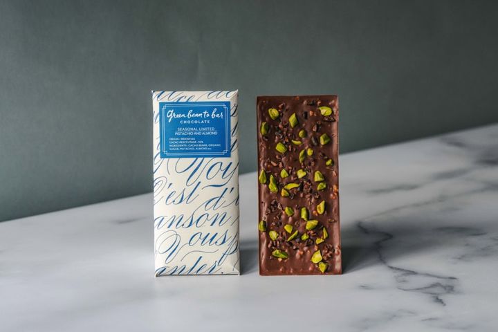 インドネシア産のカカオ豆を使用し、トップにピスタチオをトッピング。バーの中にもアーモンドを練り込み、ザクザクとした食感で食べ応えもばっちり。ナッツの香ばしさが感じられるこちらは、ウイスキーと合わせるのもアリ!