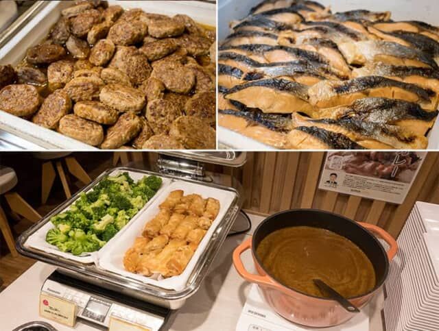 ▲ハンバーグ、鮭の塩焼き、ブロッコリー、春巻き、カレー