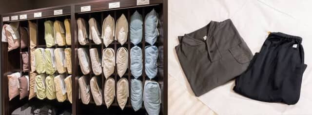 ナイトウエアはフロントロビーから持参します。眠りにこだわるスーパーホテルは、硬さや高さの異なる8種類の選べる枕を用意。低めの低反発がピンク、柔らかくてフワフワが白という具合に、枕カバーの色が決められているので、他のホテルでもお気に入りの枕がすぐに見つかる仕組みです。