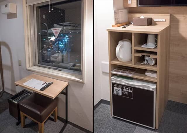 ラックには、冷蔵庫やポット、マグカップ、ドライヤーなどの備品が機能的に収納されています。