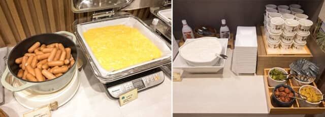 ソーセージやスクランブルエッグ、お漬物、ヨーグルトなど。