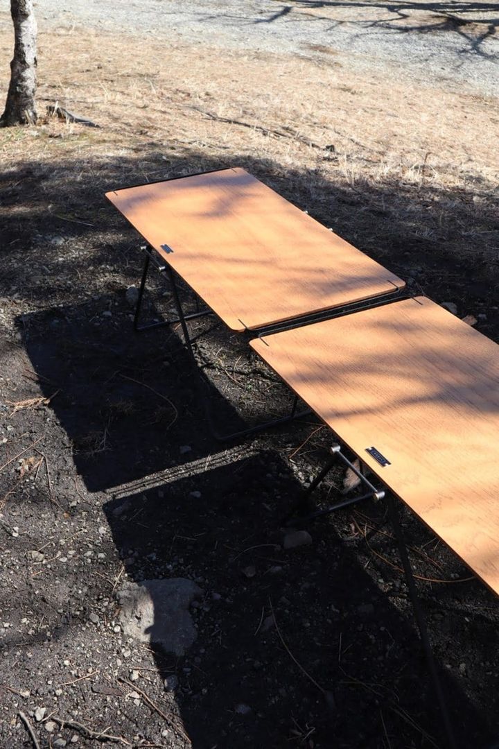 2022年に誕生したガレージブランド『NODEL(ノーデル)』のバタフライテーブル。Mサイズ1台だと、ソロキャンプに最適なサイズで、わが家は2台購入しました。