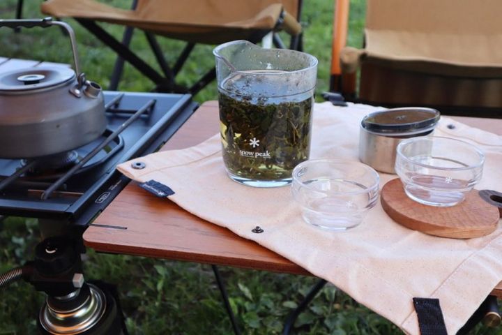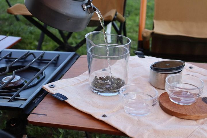 キャンプで手軽にお茶を楽しめるティーポットセット。本体がクリアなので、「サヨウ(茶踊)」という名前の通り、茶葉が踊るように広がっていく様子も見えて楽しい。