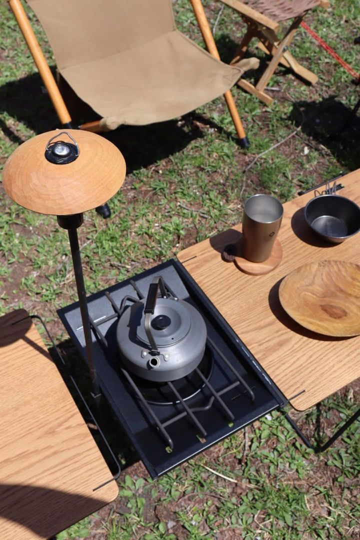 『NODEL』のバタフライテーブルに取り付けられるフラットバーナーと連結用キットをオプションで購入。2台のテーブルの間に連結すると、テーブルと同じ高さでガスバーナーを使うことができます。