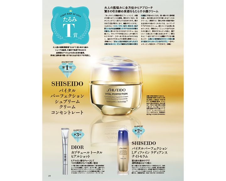 2024年上半期ベストSSTコスメたるみ賞2位に輝いた実力派。フェイスラインを引き締めながら透明感に溢れる肌へ。夜、お手入れの最後に使うユニークな使用順。独自のダイナミック4Dエクササイズを取り入れることでスッキリ引き締まった印象が期待できます。SHISEIDO バイタルパーフェクション L ディファイン ラディアンス ナイトセラム[医薬部外品]40ml ¥20,790(SHISEIDO)