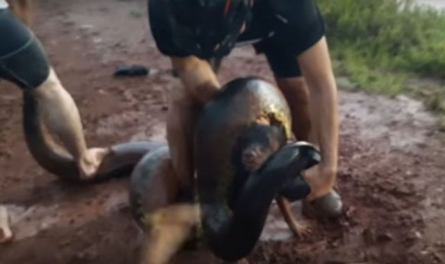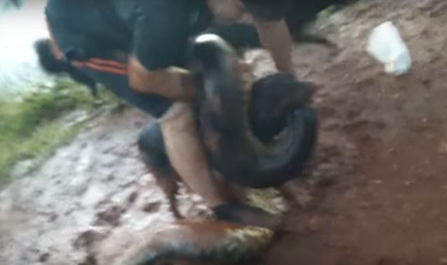 急いで駆けつけると、1匹の犬がアナコンダに捕まり、川の中に沈められようとしているところでした。 愛犬の危機に男性はすぐさま川に飛び込み、犬を見つけて仲間と一緒に犬とアナコンダを川から引き上げました。
